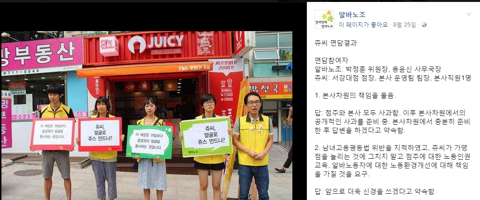 시민단체 알바노조는 지난 25일 쥬씨 서강대점 앞에서 피켓 시위를 벌이고 서강대점 점주와 쥬씨본사의 사과를 받아냈다.