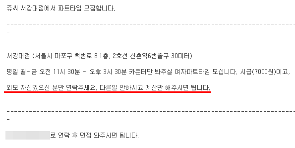지난 1일부터 최근까지 아르바이트 구인 사이트에 올라온 서강대점 쥬씨 아르바이트 공고에는 "카운터만 봐주실 여자파트타임 모십니다"라며 "시급(7천 원)이고, 외모 자신 있으신 분만 연락주세요. 다른 일 안 하시고 계산만 해주시면 됩니다" 라는 글이 있었다.