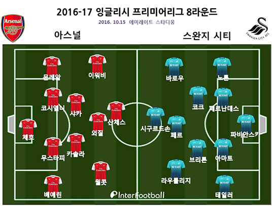 아스널은 15일 오후 11시(한국시간) 영국 런던에 위치한 에미레이트 스타디움에서 열린 스완지와의 2016-17 잉글리시 프리미어리그(EPL) 8라운드 경기에서 3-2로 승리했다. 이로써 아스널은 승점 19점으로 맨시티와 동률을 이뤘지만 득실차에서 밀리며 리그 2위로 올라섰고, 리그 6연승 행진을 이어갔다.