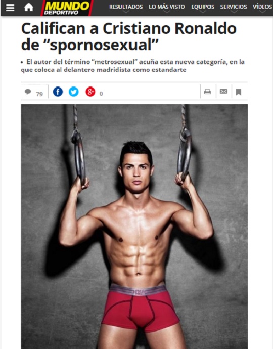 이 ‘스포르노섹슈얼’이라는 신조어를 만들어낸 심슨은 15일(한국시간) 스페인의 ‘문도 데포르티보’와의 인터뷰서 “‘스포르노섹슈얼’의 대표는 호날두라 할 수 있다”라며 “그는 자신의 굉장한 몸을 너무나도 사랑하며 그 어느 것과 바꿀 수 없는 것이라고 생각한다. 이에 그를 ‘스포르노섹슈얼’의 대표라 할 수 있다”라고 밝히며 호날두가 이 신조어에 가장 어울린다고 전했다.