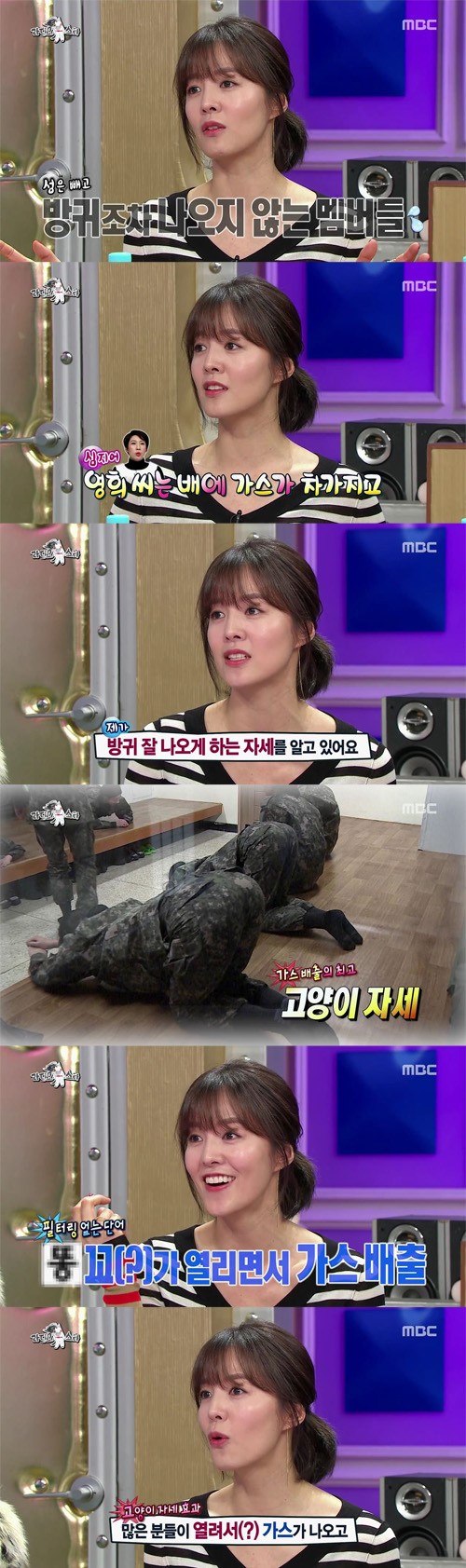 그래서 내가 방귀 잘 나오게 하는 요가 고양이 자세를 가르쳐줬다. 그걸 하면 진짜 똥꼬가 열리면서 가스가 나온다. 그래서 다들 화장실 가는데 성공했다. 그리고 김영희 바지가 다시 잠겼다"고 털어놔 스튜디오를 웃음바다로 만들었다.