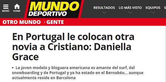포르투갈의 ‘코레이오 다 마냐’와 스페인의 ‘문도 데포르티보’에 따르면 “호날두에게 새로운 연인이 생겼다. 미국 출신의 미모의 모델이자 블로거인 25세 다니엘라 그레이스와 사랑에 빠진 것이다”라고 전했다.