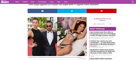 영국의 ‘더 선’은 20일(한국시간) “이리나 샤크가 F1스타 루이스 해밀턴과 함께 나타나 화제다. 호날두와 브래들리 쿠퍼와 사귄 이리나 샤크와 리하나, 니콜 세르징어와 사귄 해밀턴의 만남은 많은 관심을 집중시키고 있다”고 전했다.