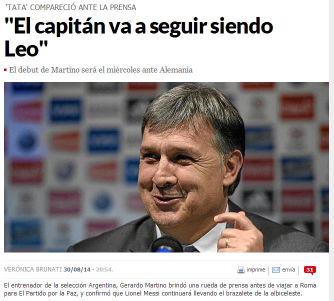 마르티노는 31일 아르헨티나 기자들과의 인터뷰에서 “나는 그동안 메시와 많은 이야기를 나눠왔다. 그는 주제에 대해 항상 간단명료하게 이야기를 한다”며 “메시가 대표팀 주장 마크를 다는 것에 대해 이견이 있을 수 없다”고 말했다. 단 “메시가 부득이하게 경기에 출전하지 못할 경우 하비에르 마스체라노가 임시 주장을 맡을 것”이라고 단서를 달았다.