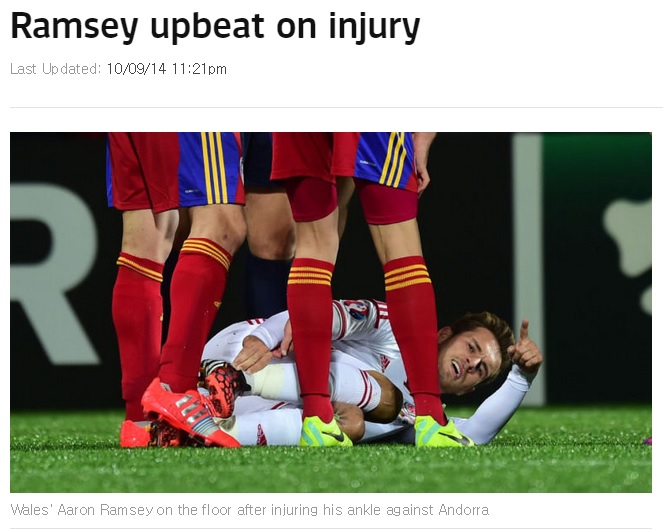 웨일스 대표팀에 차출된 램지는 지난 10일(이하 한국시간) 안도라 라 벨라에서 열린 안도라와의 유로 2016 조별예선 B조 1라운드에 선발로 나섰다가 부상으로 그라운드를 빠져나왔다. 부상 상태는 명확히 알려지지 않았었다. 다행히 큰 부상이 아닌 것으로 드러나 아르센 벵거 감독은 걱정거리를 덜게 됐다.