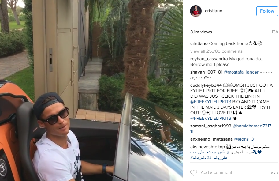 레알 마드리드는 지난 몇 년 간 승리수당으로 꽤 많은 비용을 지불했고, 호날두는 이 돈으로 근사한 새 차를 뽑았다. 차종은 ‘부가티’고, 시가는 250만 파운드(약 31억 원)로 알려졌다.
