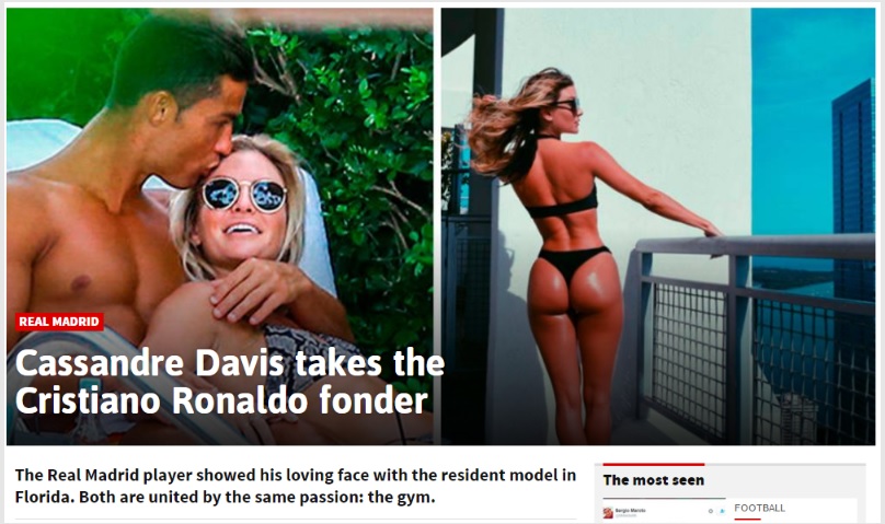 지난달 스페인의 ‘아스’는 2일(한국시간) 호날두의 새 연인은 미국의 모델 카산드라 데이비스이며 현재 미국 플로리다에서 휴가를 보내고 있음을 전했다. ‘아스’는 호날두와 데이비스가 수영장에서 다정한 시간을 보내고 있는 사진을 게재했다. 이 둘은 한 체육관에서 처음으로 만나 연인으로 발전했다고 알려졌다.