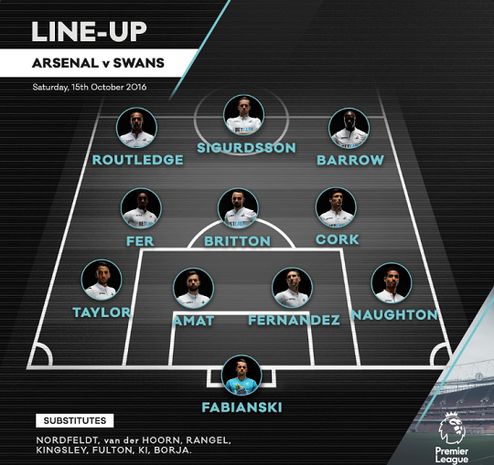 스완지는 15일 오후 11시(한국시간) 영국 런던에 위치한 에미레이트 스타디움에서 열리는 아스널과의 2016-17 잉글리시 프리미어리그(EPL) 8라운드 경기를 앞두고 11명의 선발 라인업을 발표했다.