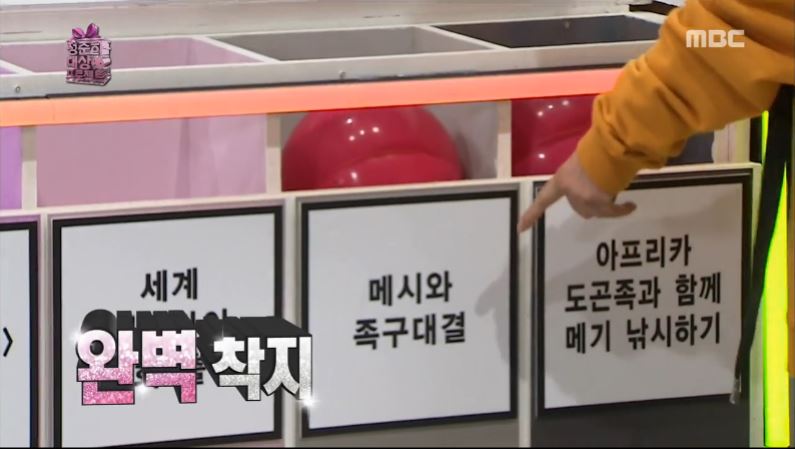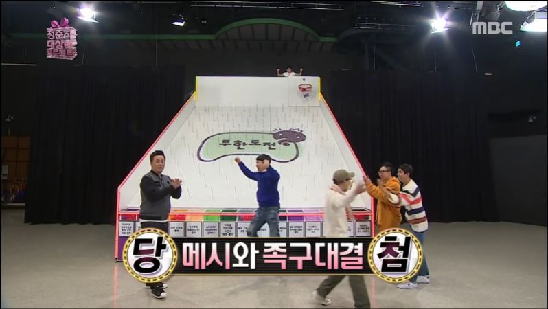 그 중 멤버들이 가장 관심을 갖고, 바랐던 미션은 메시와의 족구대결이었다. 멤버들 모두 이 미션을 뽑기 위해 노력했고, 마지막 도전자로 나선 유재석이 이 미션이 적힌 구멍에 공을 집어넣으며 메시와의 족구대결에 도전할 수 있게 됐다.