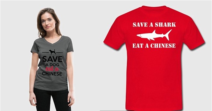 이 셔츠 앞면에는 "개를 구하고 중국인을 먹어라" (Save a dog, Eat a Chinese) "상어를 구하고 중국인을 먹어라" (Save a shark, Eat a Chinese)는 구절이 인쇄돼있다. 보신탕을 즐겨먹고 상어 지느러미 요리를 좋아하는 중국인의 식습관을 빗댄 것으로 보인다.