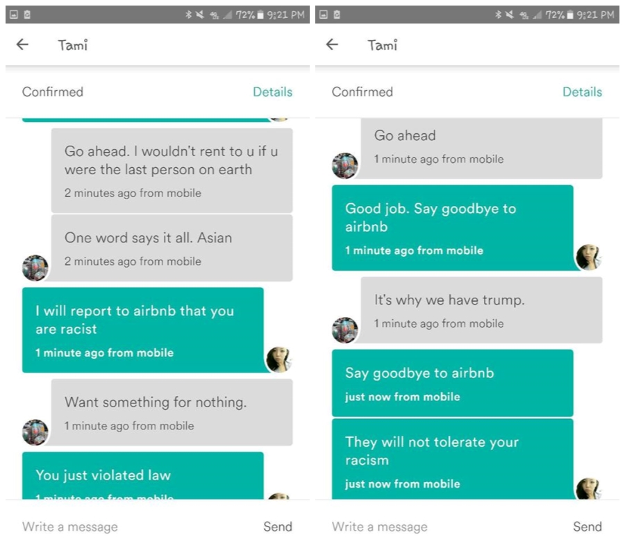 서다인씨가 집주인에게 “에어비엔비 본사에 당신의 인종차별 사실을 얘기 할 것이다”라고 하자 집주인은 적반하장격으로 “부질 없는 짓 이라고” 하며 “외국인이 미국에서 이래라 저래라 하면 안 된다”고 말했다. 그리고 “이것이 바로 미국이 트럼프 대통령을 뽑은 이유”라는 다소 무서운 설명까지 덧붙였다.
