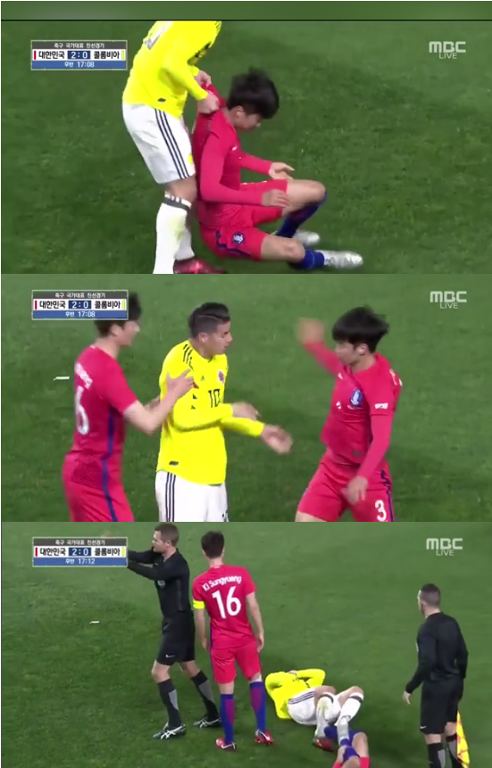 이 순간 하메스는 아무런 접촉이 없었던 얼굴을 감싸 안으며 마치 김진수와 기성용이 자신의 얼굴을 가격한 것처럼 고통스런 모습으로 그라운드에 자신의 몸을 내동댕이치며 쓰러졌다.