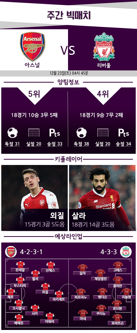 그 시작점에서 아스널과 리버풀이 만난다. 4위가 익숙한, 혹은 4위를 꿈꾸는 팀들의 만남이다. 현재 4위를 지키고 있는 팀은 리버풀. 아스널은 그 바로 밑인 5위를 지키고 있다. 이 경기 결과로 두 팀의 위치가 바뀔 수 있는 만큼 결코 놓쳐서는 안 된다.