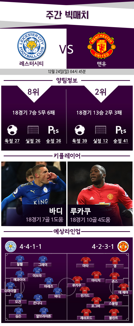 분위기 반전이 필요한 시점에서 레스터 원정을 떠난다. 비록 지난 라운드에서 연승이 끊겼지만 결코 쉬운 상대는 아니다. 주중 맨시티와 리그컵 경기에서도 승부차기까지 가는 접전을 펼쳤다. 지금의 맨유가 승리를 장담하기는 쉽지 않다는 뜻이다.