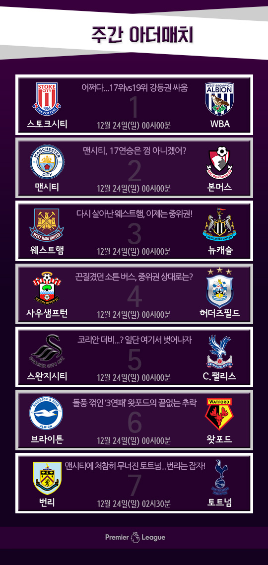1위 맨체스터 시티는 나름 쉬운 상대를 만난다. AFC본머스다. 17연승을 낙관할 수 있는 대진이다. 그 이후 일정도 뉴캐슬 유나이티드, 크리스탈 팰리스다. 어쩌면 박싱데이 주간 내에 유럽 축구 역사가 새롭게 쓰일 수도 있다.