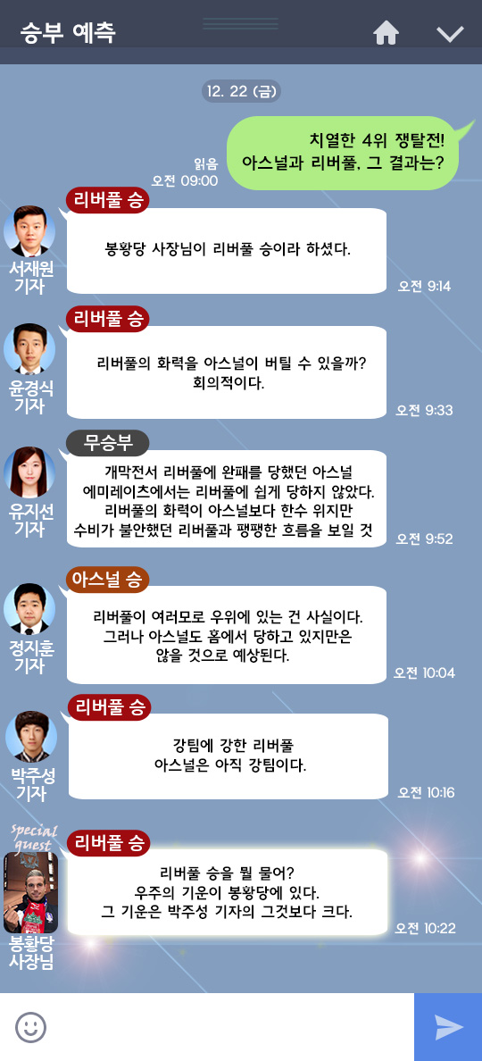 인터풋볼 기자도 3명이나 리버풀의 승을 찍었다(박주성 기자도 리버풀 승을 찍었다니 봉황당 사장님이 잠시 당황하시긴 했다). 무승부와 아스널승은 각각 1명씩이다.