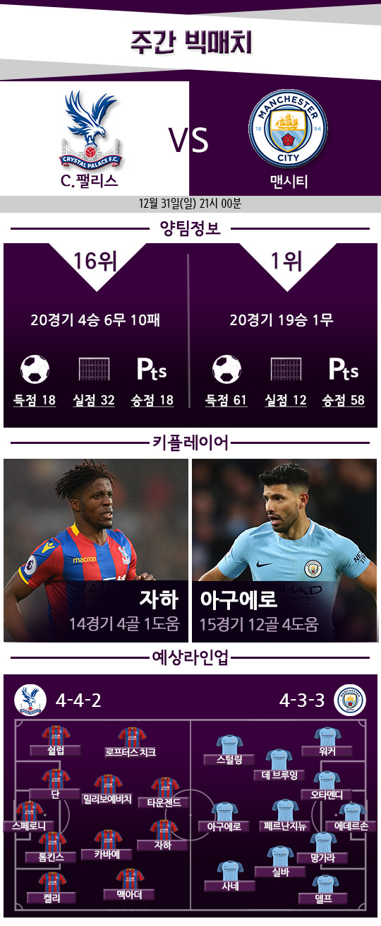 맨시티의 대기록에 제물이 될 팀은 팰리스. 모든 점에서 맨시티 보다 열세다. 게다가 아스널전(2-3패) 후 64시간 만에 경기를 치러야 한다. 맨시티는 그보다 하루를 더 쉬었다.