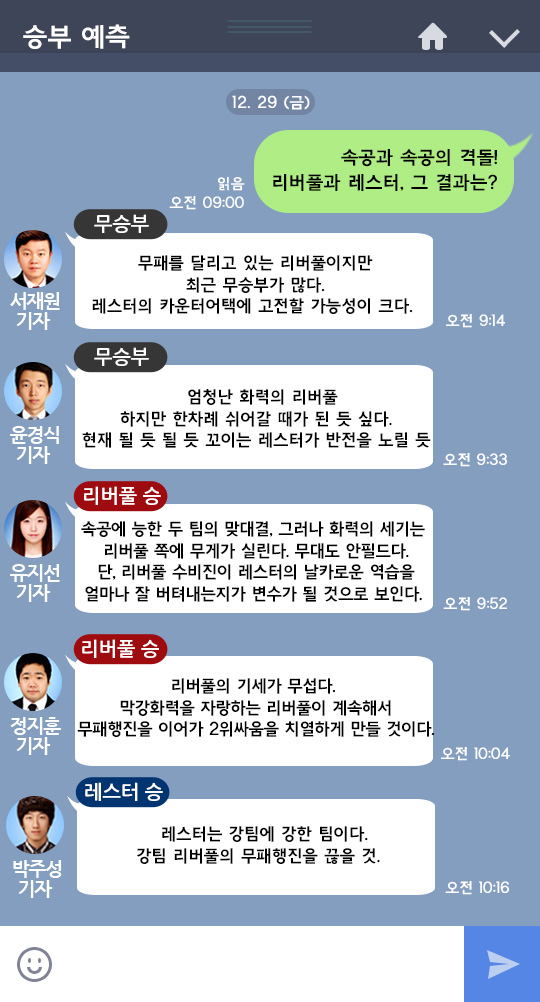 팽팽하다. 5명 기자들의 의견이 골고루 갈렸다. 리버풀 승과 무승부를 각각 2명씩 택했다. 레스터 승은 1명이다. 그런데 그 1명이 박주성 기자라 왠지 모르게 강력해 보인다.