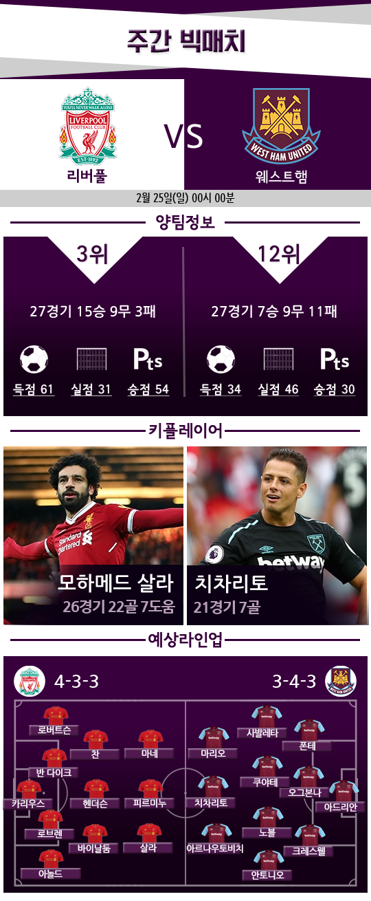 그러나 웨스트햄의 상승세도 만만치 않다. 주전 선수들의 컨디션이 올라오면서 데이비드 모예스 감독의 표정도 한결 밝아졌다. 최근 12경기에서 5승 5무 2패를 거뒀고, 강등권으로 추락했던 순위도 12위까지 끌어올렸다. 치차리토와 마르코 아르나우토비치의 득점력이 살아나고 있다는 점도 희소식이다.