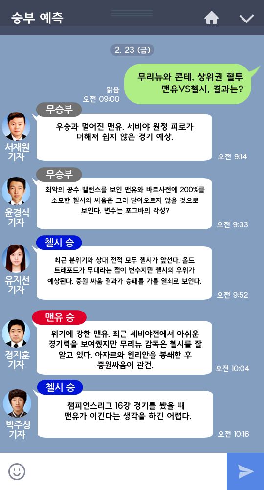 * 맨유 승 1명. 무승부 2명. 첼시 승 2명