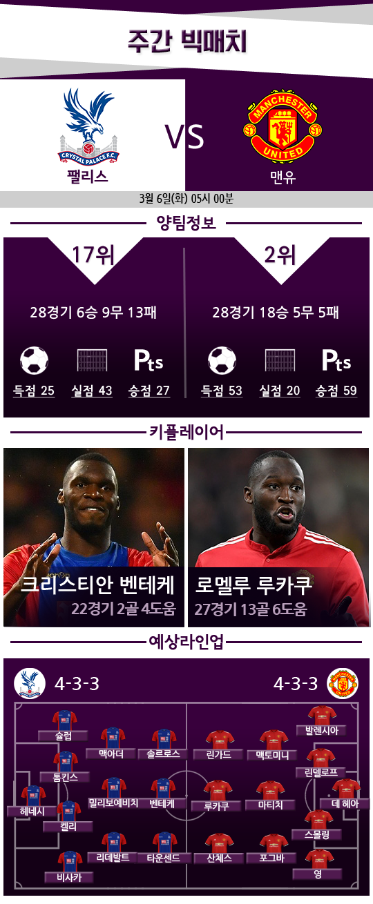 최근 활약을 고려했을 때 벤테케를 키 플레이어에 올려두긴 뭐하지만, 결국 벤테케가 제몫을 해줘야 크리스탈 팰리스도 살아날 수 있다. 토트넘전에서 케인이 그랬던 것처럼 말이다. 토트넘전에서 경기 종료 직전에 교체 투입된 이청용도 맨유전에서는 더 많은 출전 시간을 바라고 있다.