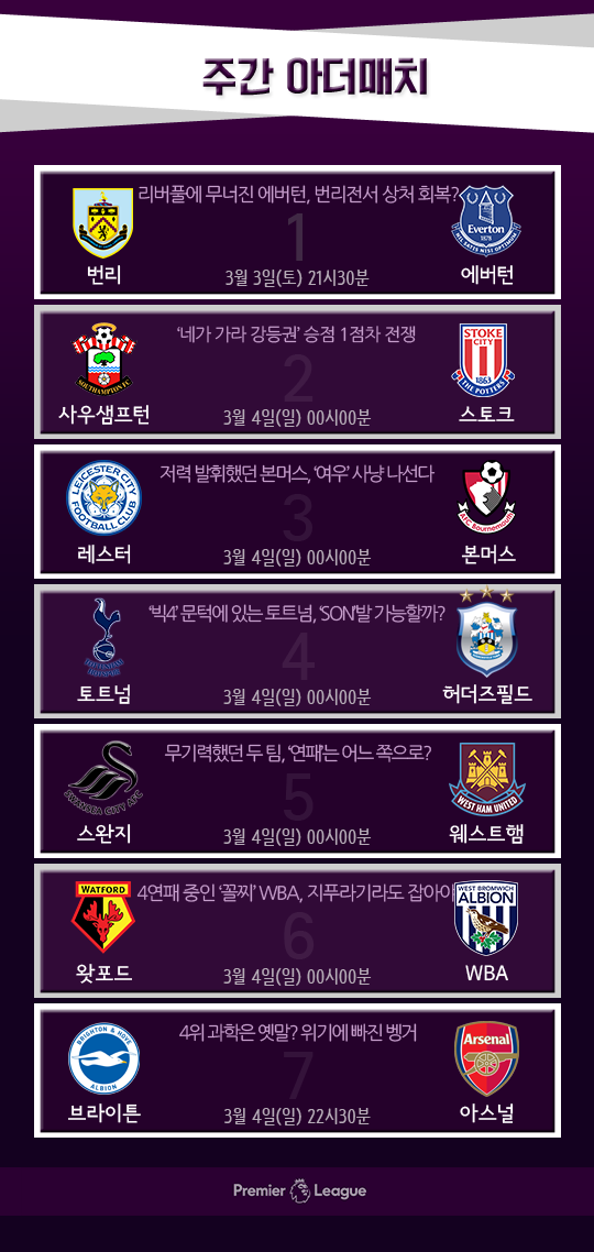 주전 경쟁에 적신호가 들어왔던 손흥민은 주중 2골 1도움을 기록하며 마우리시오 포체티노 감독 앞에서 무언의 시위를 했고, 지난 라운드에서 경기 막바지에 교체 투입된 이청용은 맨체스터 유나이티드전에서 더 많은 출전시간을 노리고 있다. 상승세가 꺾였던 기성용도 이번 주말 웨스트햄 유나이티드를 상대로 자존심 회복에 나선다.