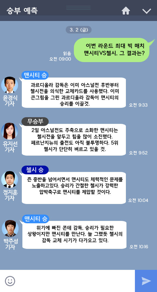 맨시티 승 2명, 무승부 1명, 첼시 승 1명