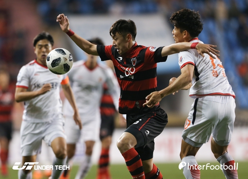 [인터풋볼= 포항] 윤경식 기자= 25일 오후 7시 30분 포항 스틸야드서 열린 KEB 하나은행 K리그1 2018 9라운드 포항 스틸러스와 제주 유나이티드 경기 전반서 포항 송승민이 돌파를 시도하고 있다.