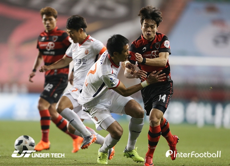 [인터풋볼= 포항] 윤경식 기자= 25일 오후 7시 30분 포항 스틸야드서 열린 KEB 하나은행 K리그1 2018 9라운드 포항 스틸러스와 제주 유나이티드 경기 후반서 포항 정원진이 돌파를 시도하고 있다.