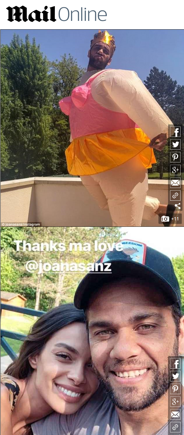 알베스는 이날 자신의 SNS에 여러 사진을 게시했다. 사진 속 알베스는 우스꽝스러운 풍선 옷을 입고 여러가지 재밌는 포즈를 취했다. 알베스는 SNS에 올린 동영상에서 "내 생일이야. 내 생일이야. 좋고 미친 생일이야"라고 웃어보였다.