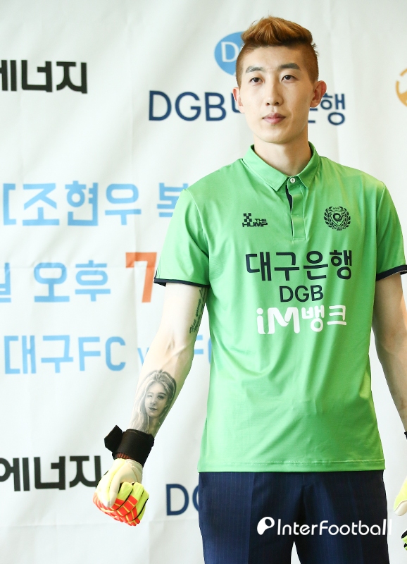 [인터풋볼= 성암로] 윤경식 기자= 월드컵 대표팀 수문장 조현우(대구FC)가 K리그 복귀를 앞두고 4일 오후 4시 30분 서울 마포구에 위치한 서울시 마포구 중소기업 DMC 타워에서 간담회를 가졌다. 조현우가 와이프의 얼굴을 새긴 문신을 보여주고 있다.