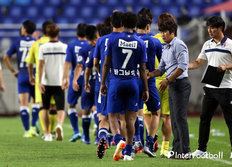 [인터풋볼= 수원월드컵경기장] 윤경식 기자= 7일 저녁 7시에 열린 수원 삼성과 제주 유나이티드의 KEB 하나은행 K리그1 2018 15라운드서 수원 서정원 감독이 경기에서 패한 선수들을 위로하고 있다.
