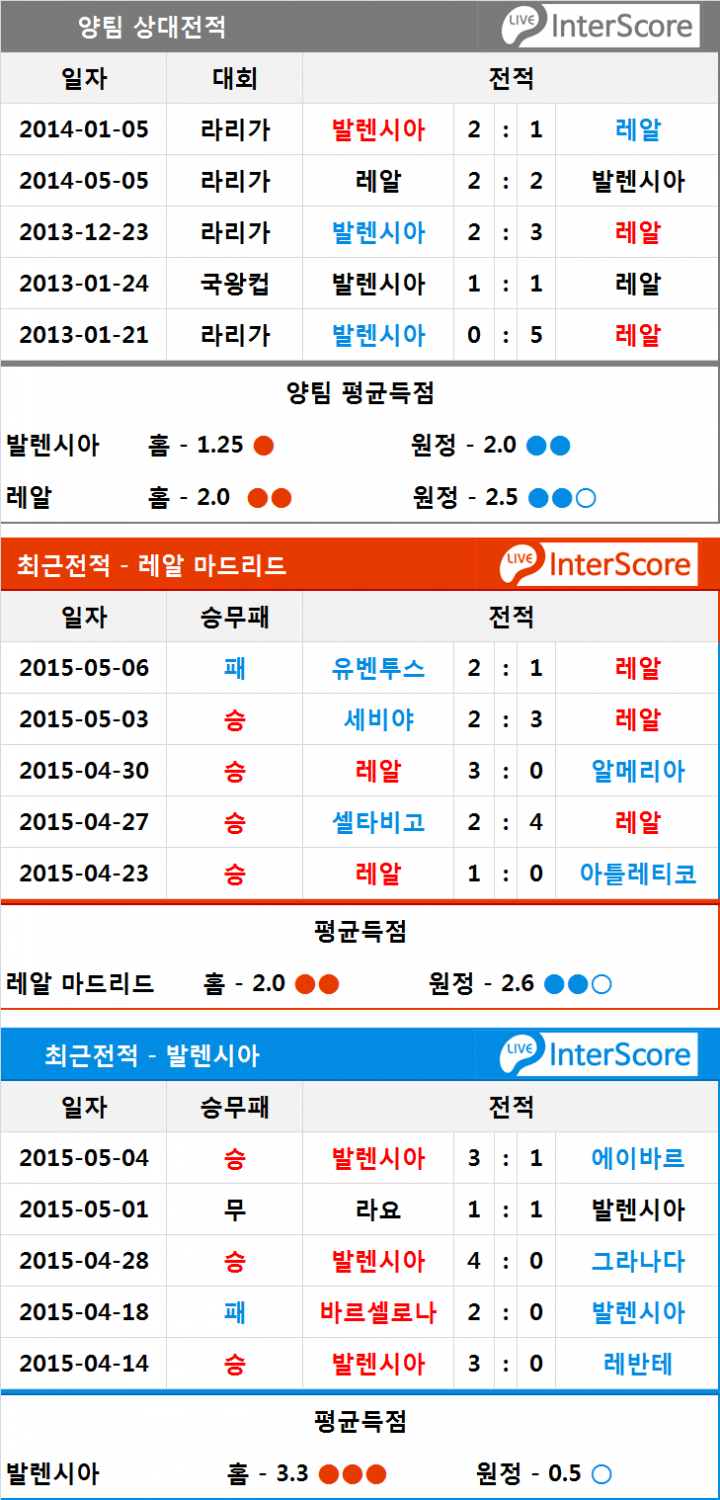 스포츠 데이터 분석과 라이브스코어를 제공하는 ‘인터스코어’에 의하면 두 팀의 최근 5경기 성적은 레알 4승 1패, 발렌시아는 3승 1무 1패다. 양 팀의 최근 5경기 상대전적은 2승 2무 1패로 레알이 우위에 있다. 최근 흐름을 봤을 때 레알이 발렌시아 보다 우세한 경기를 펼칠 것으로 예상된다.