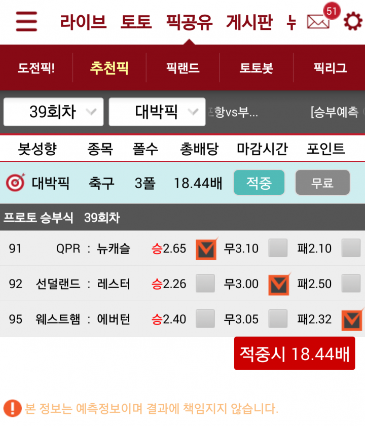 그에 따르면 최근 본인이 관심을 많이 갖고 있는 영국축구리그 경기에 대해 응원을 하고 동시에대상 경기에 대해서 스포츠토토를 구매 하려고 했지만 막상 승부예측에 대한 확신이 없었다고 한다. 헌데 마침 “인터스코어” 앱 픽공유 메뉴안에 있는 추천 픽에서 본인이 구매하려는 경기에 대한 추천 픽이 있는 것을 보고 그대로 따라 했던 것이다. 결과는 18.44배 당첨.