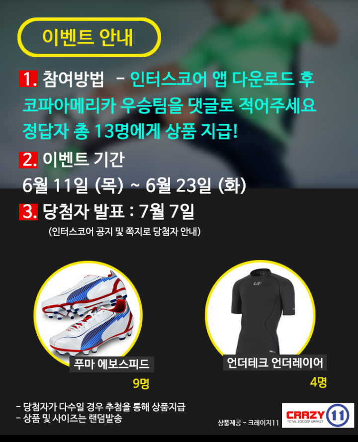 참여방법 : 안드로이드 마켓에서 ‘인터스코어’ 앱 다운로드 후 ‘코파아메리카’ 우승팀을 이벤트 게시판에 올리면 끝!!! 추첨을 통해 13명에게 상품지급(당첨자가 다수일 경우 추첨)