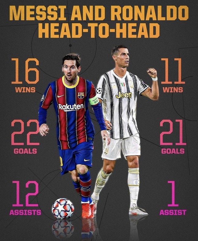 메시와 호날두가 서로 맞붙은 경기의 상대전적을 비교하면 메시는 16승 22골 12도움을 기록했다. 이날 1승을 추가한 호날두는 11승 21골 1도움을 쌓았다. 무승부는 9차례 나왔다. 메시는 항상 바르셀로나 소속이었고, 호날두는 맨유에서 3경기, 레알 마드리드에서 30경기, 유벤투스에서 1경기를 치렀다. 36경기 안에는 A매치 2경기도 포함되어 있는데 메시(아르헨티나)와 호날두(포르투갈)는 나란히 1승 1패를 거뒀다.