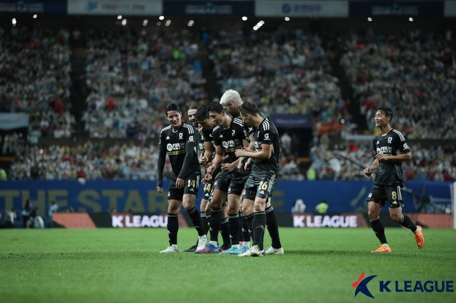 [인터풋볼=하근수 기자(상암)] 팀 K리그 선수들이 약속을 지켰다. 천금 같은 동점골 이후 '빅맨 세리머니'가 펼쳐졌다.