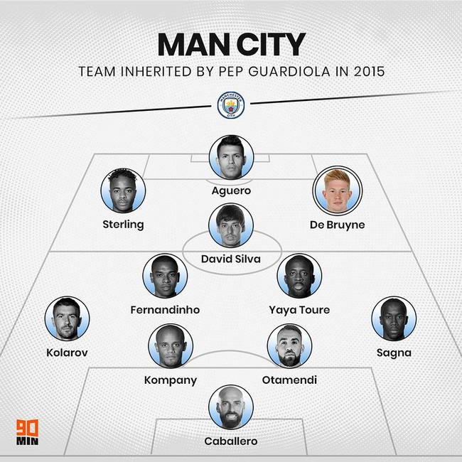 펩이 맨시티로 부임했을 당시에도 팀은 프리미어리그(EPL) 우승을 충분히 노릴 수 있을 정도로 강한 팀이었다. 당시 선수단의 이름값만 봐도 리그 최고 수준이었다. 4-2-3-1 포메이션을 기준으로 최전방에는 세르히오 아구에로가 뛰고 있었다. 2선에는 라힘 스털링, 다비드 실바, 더 브라위너로 강력했다.