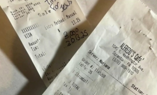 현지 매체 보도에 따르면, 에릭 스미스는 지난 6월 펜실베이니아주 스크랜턴의 한 식당에서 피자를 주문해 먹고 음식값 13달러 25센트(약 1만5천원)을 결제하며 서빙했던 종업원 마리아나 램버트에게 무려 3,000달러의 팁을 남겼다.