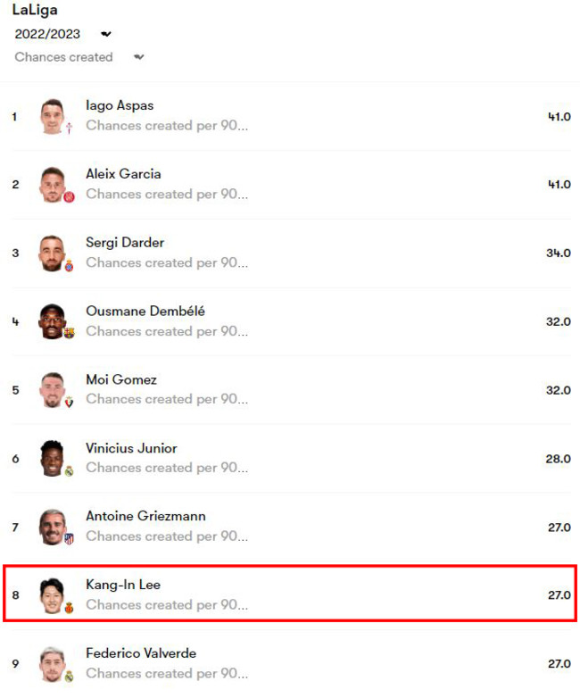 기회 창출 횟수도 이강인은 라리가 최상위권이다. 이강인은 이번 시즌에만 27개의 기회를 창출하면서 리그 공동 7위에 자리했다. 이강인의 창의성은 세계적인 선수들과 수준을 나란히 했다. 앙투완 그리즈만과 페데리코 발베르데가 기회 창출 횟수가 이강인과 동일했다. 창의성하면 전 세계적으로 인정받는 루카 모드리치와 페드리도 이강인보다 기회 창출 횟수가 낮았다.