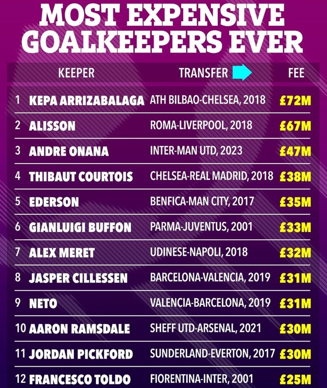엄청난 액수인데 케파, 알리송을 넘지 못했다. 역대 골키퍼 이적료 2위 알리송은 2018년 AS로마에서 리버풀로 이적할 때 이적료가 6,700만 파운드(약 1,106억 원)였다. 오나나보다 무려 2,000만 파운드(약 330억 원) 비쌌다. 케파는 그 위다. 2018년 아틀레틱 빌바오에서 첼시로 올 때 이적료만 7,200만 파운드(약 1,188억 원)였다.
