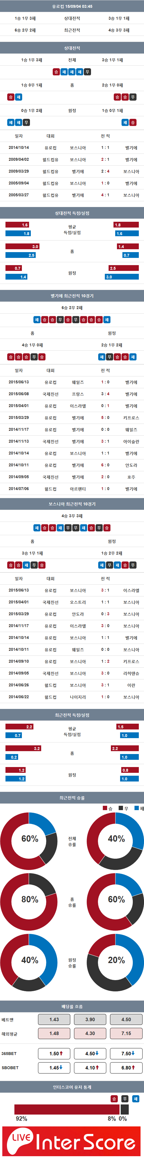 최근 홈경기서 보스니아는 벨기에를 맞아 1-1 무승부였고 최근 원정에서 2009년 벨기에를 2-4로 격파한 전적이 있다.