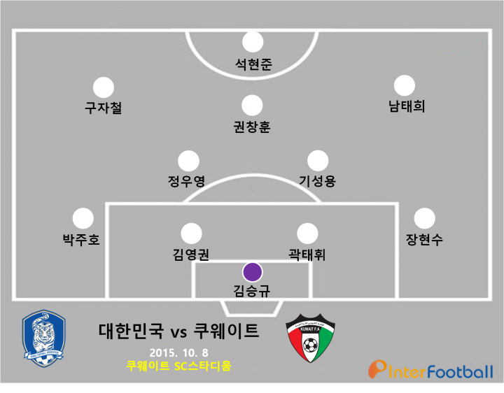 [인터풋볼] 서재원 기자 = 9회 연속 월드컵 본선 진출을 노리는 대한민국 축구대표팀이 쿠웨이트전에 나설 선발 라인업을 발표했다. 포르투갈 리그에서 7경기 5골 5도움의 맹활약을 펼치고 있는 석현준이 원톱에 선다.