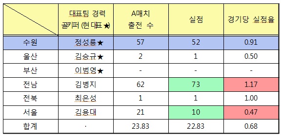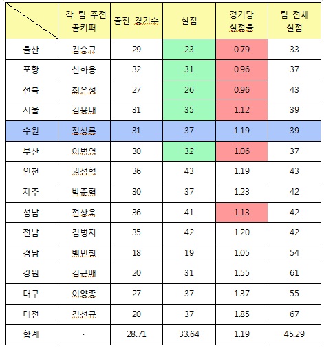 반면 대표팀에서 경쟁자로 떠오른 김승규(울산)는 29경기에서 23골 밖에 허용하지 않았다. 써드 골키퍼인 이범영(부산)도 32실점으로 정성룡보다 실점율이 낮다.