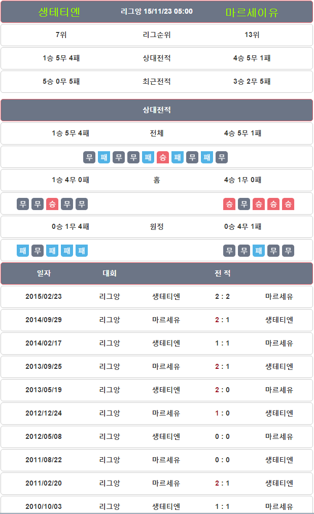 생테티엔의 이번 리그 특징은 홈경기에서 강하다는 것이다. 리그앙 홈에서 치렀던 6경기 중 패배한 경기는 니스를 상대로 했던 9월28일 경기였고 4승1무1패의 홈경기 전적을 가지고 있다. 반면 마르세유는 6개의 원정경기 전적이 2승1무3패이다.